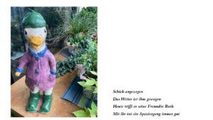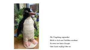 Nach Fertigstellung der Figuren gestalte ich eigene Texte, welche die Figur auch mit ihren evtl. Makeln und den Begebenheiten/ Geschichten ihres Schaffens widerspiegelt.